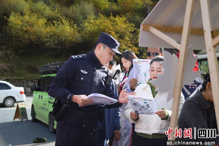 中新网四川新闻11月10日电 近日,平武县的壮丽彩林迎来最佳观赏期,吸引了大量游客前来打卡留念。徜徉于如画风景中的游客们发现,除了漫山遍野的绚烂“彩”色,还有一抹温暖人心的独特“警”色。