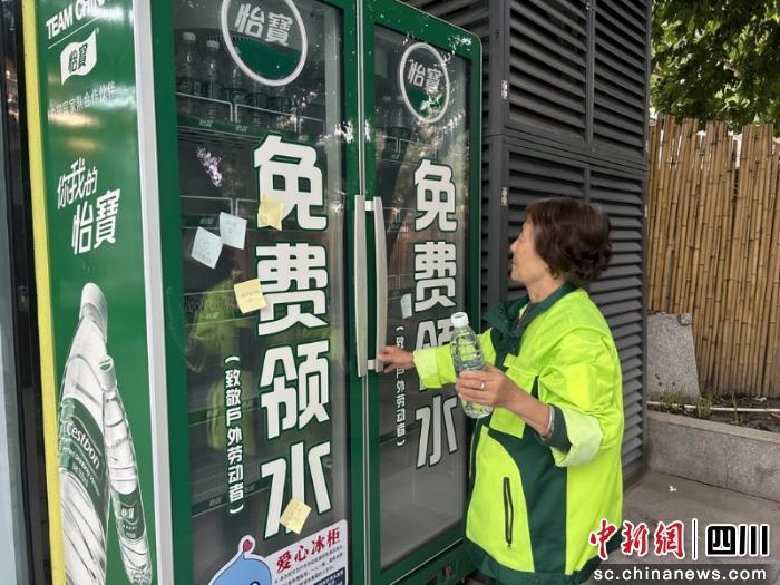 走进驿站,门口右侧的“爱心冰柜”总能吸引路人目光。这是四川省首个户外劳动者关爱站点,已累计为户外劳动者、困难居民提供上万瓶饮用水。“在这边扫街干活,渴了随时能来拿瓶水,太贴心了。”环卫工人周大姐边拿水边说。