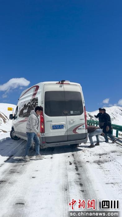 中新网四川新闻4月20日电(杨莉)近日,甘孜县烟草公司驾驶员孟雪松执行出差任务,驾车行驶至乃龙山顶。山路本就崎岖,加上风雪交加、路面湿滑,能见度很低。走着走着,他发现前方一辆北京牌照的房车横在路边,车轮空转,车身不时晃动,几名游客和当地老乡站在车旁,满脸焦急,手足无措。