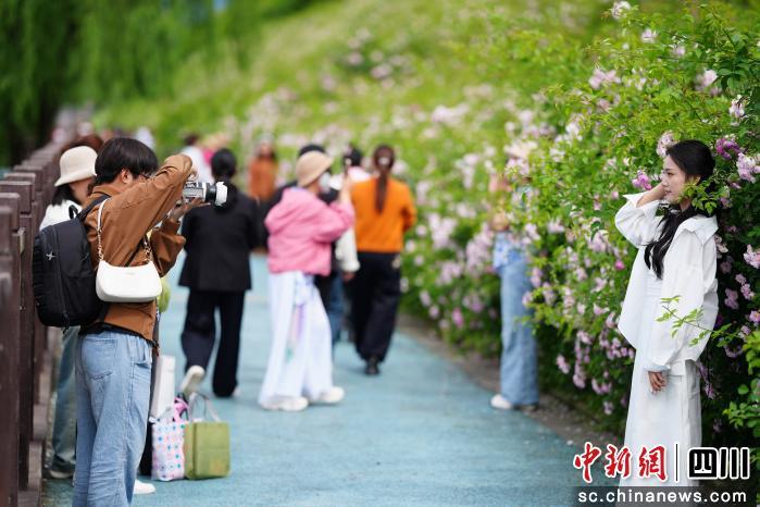 中新网四川新闻4月23日电 (刘艳 周俊)阳春三月,广元市旺苍县亲水栈道沿线的蔷薇花竞相开放,形成一道绵延数百米的“花海长廊”,为春日东河增添浪漫色彩,吸引众多市民前来打卡,尽享美好春光。