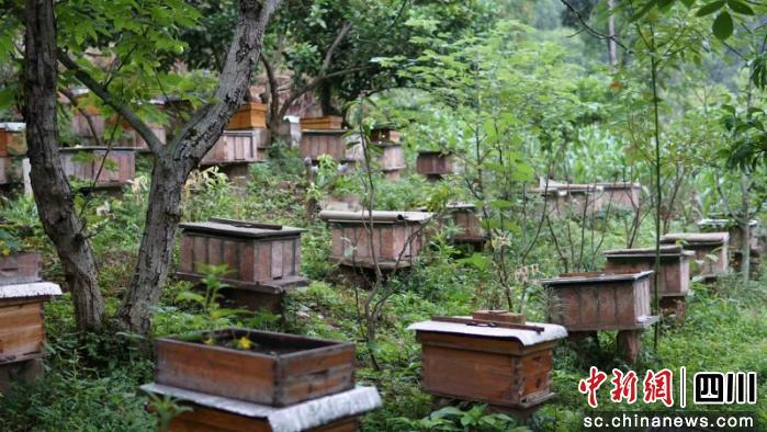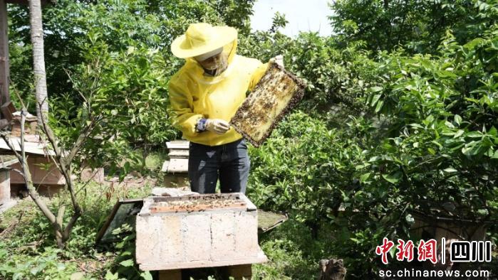 中新网四川新闻4月24日电(吴奇 韩斌旭)“和朋友闲聊时,他告诉我,在门口放一个空箱子,蜜蜂就会自己飞过来。我回家一试,果然引来了蜂群,这让我对养蜂产生了浓厚兴趣。”说起自己走上养蜂这条路的经历,蜜蜂养殖基地负责人廖维东显得兴致勃勃。近日,走进资阳市安岳县来凤乡团建村13组,见到了身着防护装备,小心翼翼地检查巢脾的廖大哥。