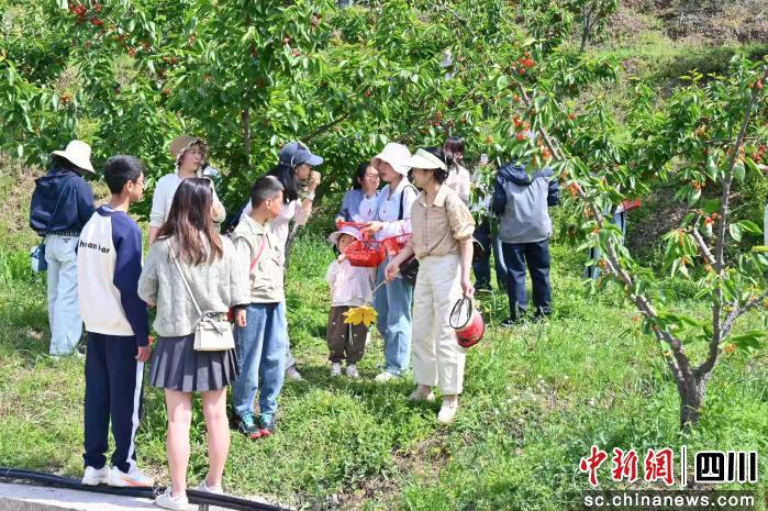 中新网四川新闻4月24日电 (冉金鹭)阳春三月的广元市朝天区沙河镇,清风裹挟着清甜果香漫过山野,白虎村的樱桃园里更是一派热闹景象。4月24日,阳光正好,慕名而来的游客穿梭在葱郁的樱桃林间,指尖轻捻颗颗红如玛瑙、莹润饱满的果实,欢声笑语与枝头果香交织在一起,勾勒出沙河镇樱桃产业蓬勃发展的生动图景。