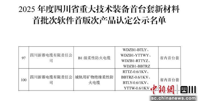 中新网四川新闻3月17日电(黄成薇)近日,四川省经济和信息化厅发布“关于2025年度四川省重大技术装备首台套新材料首批次软件首版次产品的公示”,四川新蓉电缆有限责任公司自主研发的“B1级柔性防火电缆”与“城轨用矿物绝缘柔性防火电缆”荣耀上榜,成功获得省级“首台套”认定。这不仅是对新蓉电缆技术创新实力的权威认可,更标志着公司在高端特种电缆领域取得了突破性进展。