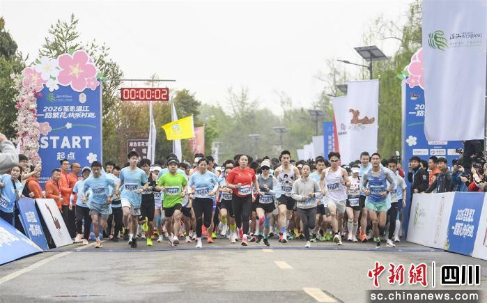 中新网四川新闻3月29日电(王剑平)29日,备受关注的2026圣恩温江“一路繁花”快乐村跑在成都市温江区鲁家滩湿地公园开跑。这场由温江自主培育的乡村体育IP,以“花”为媒、以“跑”为引,吸引近三千名跑者涌入金马河畔的“繁花赛道”。