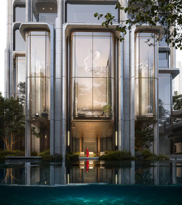 在天樾锦颂,建筑被整体抬高约2.5米,如若浮岛,创造出领航级的最大约14.4米架空层高度,让首层拥有普通住宅近5层的景观视野,搭配瑰丽而温润的浅调天然石材与玻璃幕墙,就此打破烟火、绿意、阳光与室内生活的界限。同时融“竹”之?韵于建筑立面线条,与公园?林的诗意与茶馆?椅闲适,隔空上演一场深层对话。