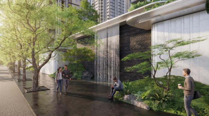地处城央,烟火气最是无法割舍。因此,不同于以往豪宅的“高墙大院”,天樾锦颂将整个社区最具昭示性的约220米“超级界面”,变为了城市的互动景观长廊。哪怕并非业主,也能在这里的石椅上小憩,在这里的树荫下听瀑,犹如“烟火成都的生活展厅”。