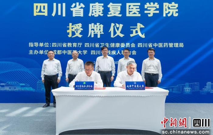 戴作安宣读《四川省教育厅关于同意成立四川省康复医学院的批复》。冯全生与黄卫德分别代表成都中医药大学、四川省残疾人联合会签署共建四川省康复医学院合作协议。(完)