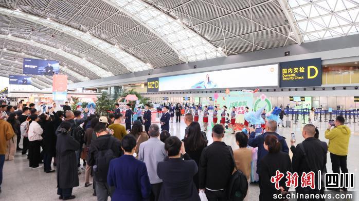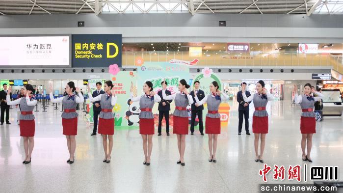 上午9时,随着动感的节拍,“泛美号”春假航班主题活动在双流机场热烈启幕。泛美教育集团旗下四川西南航空职业学院的学生们身着制服,不仅呈现了一场展现准民航人卓越风姿的职业走秀,更以优雅俏皮的舞蹈表演惊艳全场。随后,成都航空的乘务员们也加入其中,双方共同以青春律动点燃了现场的热烈氛围。这场突如其来的“惊喜”引得过往旅客纷纷驻足打卡。“表演非常精彩,我正好要乘坐这趟航班去旅游,还没出发就已经很期待了。”一位即将飞往兰州的旅客感叹道。
