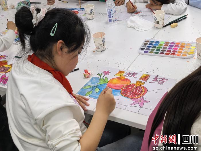 “为什么要画石榴籽?”“因为各族人民像石榴籽一样紧紧抱在一起。”这句朴实的话语深深印在孩子们心中,在美术老师的引导下,孩子们专注地描绘心中的“石榴”,颗颗饱满,籽粒相拥。一位小姑娘郑重落笔,在画旁写下“民族团结”四个字。