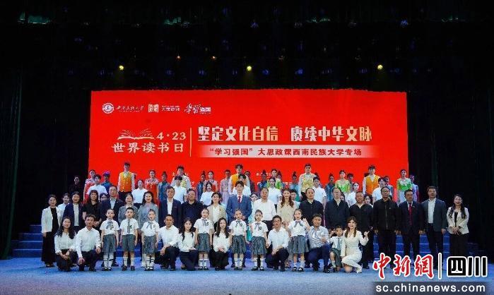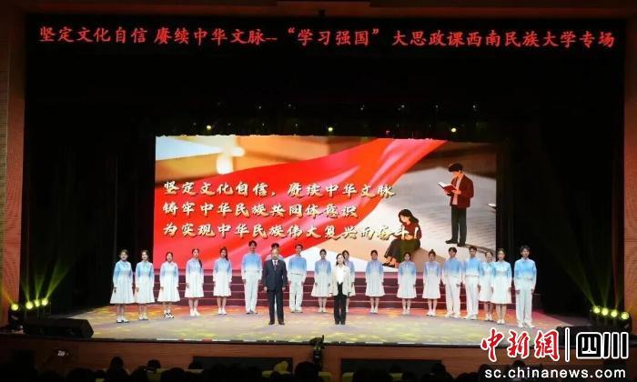 中新网四川新闻4月24日电 23日,在“第31个世界读书日”之际,一场以“坚定文化自信 赓续中华文脉”为主题的沉浸式“大思政课”在西南民族大学新星剧场顺利举行。本次活动由西南民族大学、“学习强国”四川学习平台主办,西南民族大学党委学生工作部、艺术学院(美育教育中心)承办,师生代表共聚一堂,以诵读传承经典,以歌声激荡青春,奏响了一曲大中小学同上一堂思政课的时代交响。