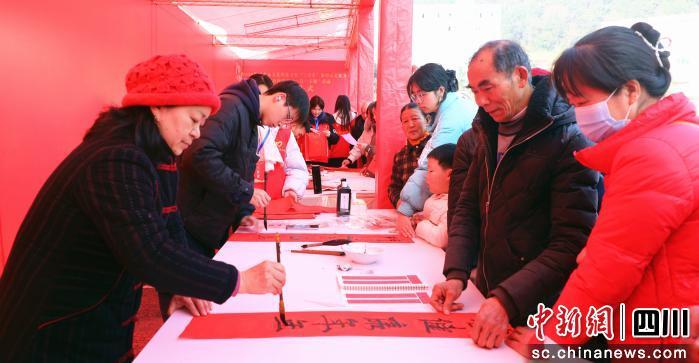 红纸铺开,墨香飘散。书法家们挥毫泼墨,一副副寓意吉祥的春联、一张张饱满圆润的“福”字很快传递到乡亲手中。红纸映照着笑脸,年的气氛浓了。法律咨询台前,民警和司法工作者正用本地方言,结合近期真实案例,讲解养老诈骗、电信网络诈骗的新花样,帮大家扎紧“钱袋子”。国防教育展板前,一群青少年驻足观看。南充军分区政治工作处的工作人员从历史讲到当下,阐释国家安全与每个人的关联,一颗关心国防、热爱国防的种子悄然播下。