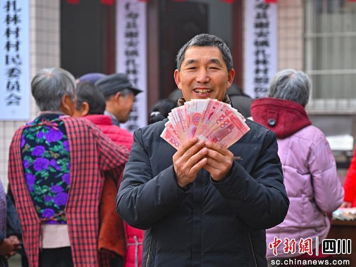中新网四川新闻2月13日电 (刘忠俊 郭侨 刘润红)春节前夕,眉山市仁寿县谢安镇扎林村一场承载着全村人期盼的集体经济分红大会热闹启幕,一沓沓崭新的钞票,正化作实实在在的幸福,送到每一位村民手中。“2025年,咱们村集体经济收入达32万元!”扎林村党总支书记张大志一边麻利地登记分红名单,一边抬高声音向村民报喜,“这钱,是咱们全村人的心往一处想、劲往一处使,实打实干出来的,更是咱们扎林村乡村振兴的‘成绩单’。”