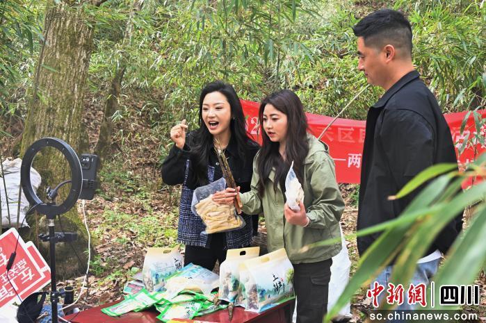 中新网四川新闻4月17日电 (冉金鹭)春风拂竹海,春笋破土来。近段时间,广元市朝天区两河口镇大尖山村省级现代竹产业基地,千亩巴山木竹郁郁葱葱,鲜嫩春笋顶破土层、长势喜人。村民们提着口袋、背着背篓穿梭在竹林间,忙着采挖鲜笋;竹林间,助农网络主播“山里鲜哥”和“瘦瘦”架起设备,开启直播,将深山鲜笋“云端”售卖……一幅生态美、产业兴、百姓富的春日丰收图景在山林间铺展开来。