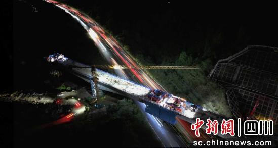 强光穿透夜幕,照亮了跨渝蓉高速特大桥的合龙作业面。四川路桥的建设者们头戴安全帽,在全封闭造桥机内,精细地进行着(72+128+72)米连续梁中跨的最后混凝土浇筑。