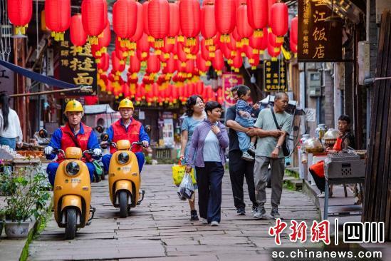 在洪雅县柳江古镇,国网四川电力(眉山洪雅)连心桥共产党员服务队队员们一大早就骑着电动车(当地俗称“电马儿”),穿梭在古街老巷之中,挨家挨户为商户开展用电安全检查。在一家“全电民宿”里,队员刘杰与同事一同仔细检查了电热水器、空调、厨房电器等大功率用电设备,同时对民宿内的外露线路进行了全面排查,严防线路老化、短路等问题。“这几天古镇游客特别多,民宿房间早就订满了,有你们上门来检查用电安全,我们经营起来心里踏实多了。”民宿老板朱洪称。
