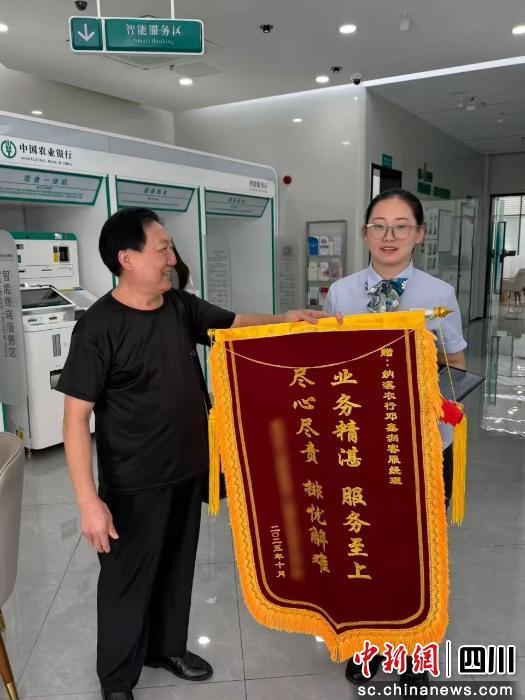 次日,舒先生来到泸州纳溪支行,为邓鑫润送上一面写有“业务精湛服务至上,尽心尽责排忧解难”的锦旗。他紧紧握住邓鑫润的双手激动地说:“谢谢你,小姑娘!帮我追回了养老钱!”(完)