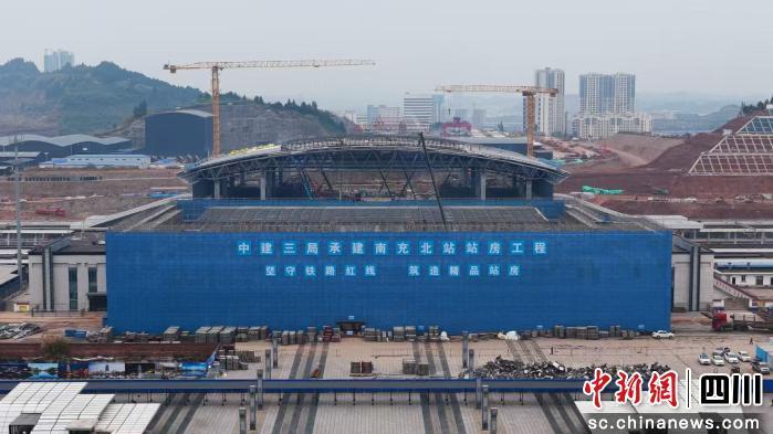 “目前第一阶段主体结构及站台施工已基本完工,正集中力量推进钢结构屋面,四、五站台装饰装修及玻璃幕墙施工,全力朝着节点目标推进。”中建三局南充北站项目经理张旭介绍,此次改扩建工程涵盖站房、站台、雨棚等多项核心工程,其中新建高架站房建筑面积达1.53万平方米,建筑高度34.3米,设有地下出站层、站台层、高架候车层及商业夹层,建成后将大幅提升旅客出行体验与车站承载能力。