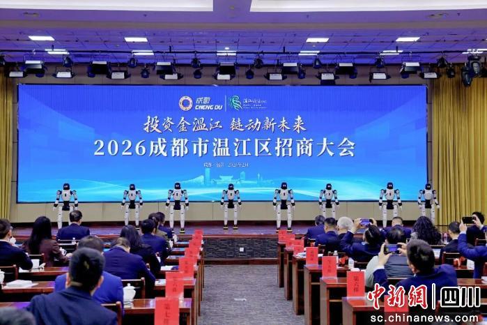 中新网四川新闻2月28日电 随着《快乐崇拜》的动感节奏响起,8台整齐列队的黑白配色、脚踏“黄靴”的智能机器人,摆臂、扭胯、步伐切换一气呵成,机械的利落与舞蹈的韵律完美交融……这不是马年春晚的机器人表演舞台,而是2026成都市温江区招商大会的现场。