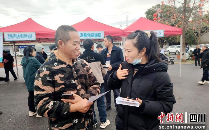中新网四川新闻3月12日电 (刘忠俊 何鑫)3月12日,洪雅县人力资源和社会保障局工作人员走进洪川镇,开展“送岗下乡”招聘活动,吸引了不少求职者驻足咨询。