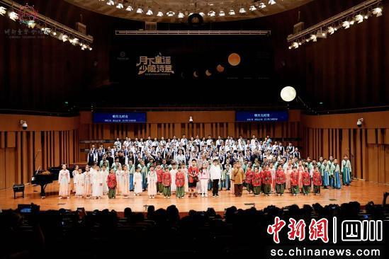 中新网四川新闻9月28日电 (唐倩)9月27日晚,成都交响乐团音乐厅内响起了唱着“秋日融融,萧萧梧叶,知有儿童挑促织”的温暖歌声。由成都市文化广电旅游局主办、成都交响乐团承办、成都童声合唱团执行演出的“月下童谣·少陵诗意”中秋情景音乐会,以一曲《诗里的四季》拉开了中秋奇遇的序幕。