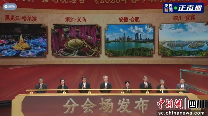中新网四川新闻12月29日电(吴平华 范军)28日,中央广播电视总台《2026年春节联欢晚会》发布四地分会场。黑龙江哈尔滨,浙江义乌,安徽合肥,四川宜宾四个风格鲜明、各具特色的分会场将携手北京主会场,与全国各族人民共庆佳节,在除夕夜为全球受众奉上欢乐吉祥、喜气洋洋的“文化年夜饭”。