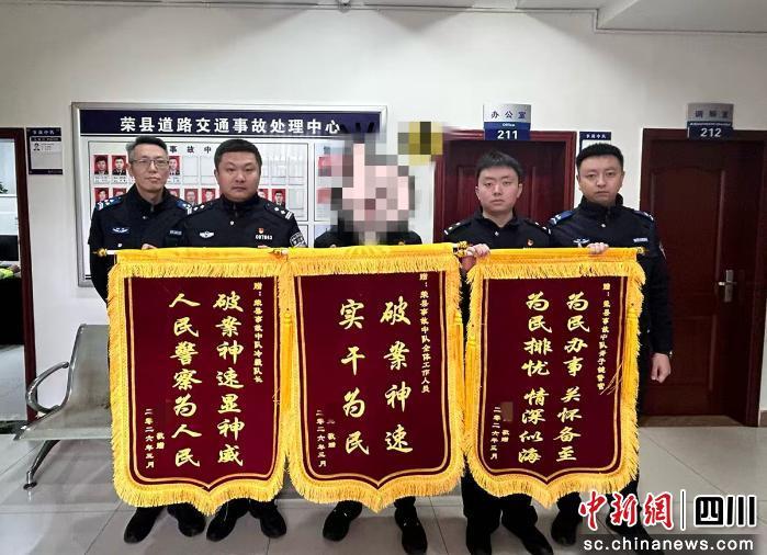 中新网四川新闻3月18日电 (杨俊 李泽熹)近日,自贡市荣县辖区“2·14”咂口石路段交通肇事逃逸案成功告破,伤者家属满怀感激地将三面锦旗送至荣县公安交通管理大队,对办案民警及交警中队高效履职、神速破案表示感谢。