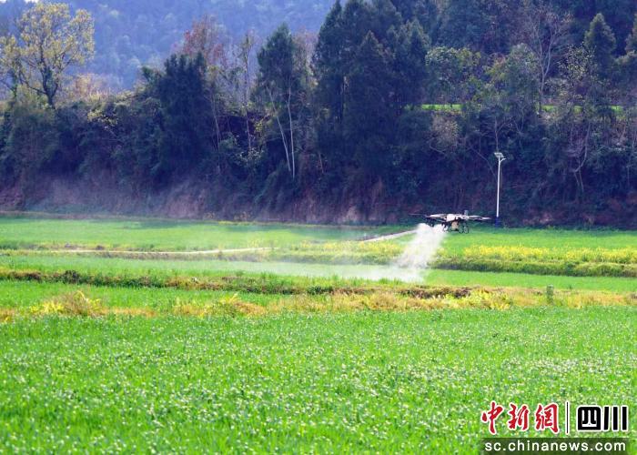 当前正是小麦孕穗、油菜结荚的关键时期,也是病虫害防控的攻坚期。在西充县春源种植专业合作社,传统的“弯腰弓背”喷洒场景已被现代农业技术取代。伴随着阵阵嗡鸣声,几架农用无人机在技术人员的娴熟操控下腾空而起,沿着碧绿的麦田匀速低空飞行,雾状的生物农药均匀洒落,为正在孕穗的小麦穿上了防治病虫害的“保护衣”。