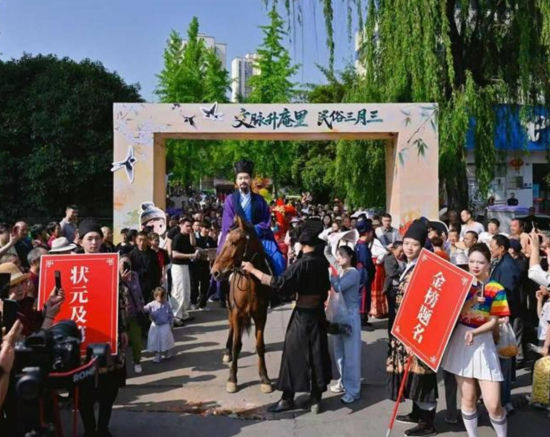 上午9时30分,随着一声锣响,状元主题巡游正式登场!明代状元杨升庵“穿越”现身,身着锦袍、仪态儒雅,仿佛从历史书中走了出来;紧随其后的萌娃“小状元”方阵格外吸睛,孩童们身着古装、步履铿锵,憨态可掬的模样引得路人频频驻足、直呼可爱。