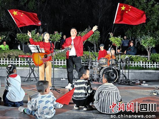 中新网四川新闻9月30日电 (曾媛)“咚!咚!咚!……”29日傍晚,广元市朝天区大中坝广场的夜空被清脆的手鼓声打破。舞台上,几位身着红色卫衣的表演者轻击手鼓,伴着悠扬笛声,缓缓唱响《红山果》。台下,一群手举小红旗的儿童踩着节拍蹦跳欢呼,一场融合情景表演与多元艺术的群众文化展演在璀璨灯火中拉开帷幕。