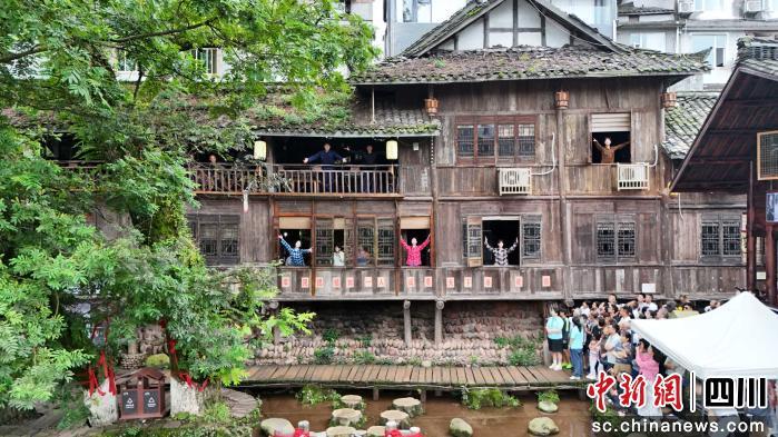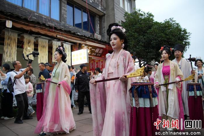 洪雅柳江古镇作为文化体验核心区,推出沉浸式情景戏剧《烟雨柳江》与中秋祭月大典两大特色活动。《烟雨柳江》在曾家园等实景场地开演,通过清代婚俗、解放初期支援边疆、现代时空穿越三个篇章,让游客深度参与剧情;祭月大典活动再现宋风巡游、盥洗献礼等古礼,“赠桂寄愿”环节中两岸同胞共诵“但愿人长久,千里共婵娟”,“合璧题字”以“月”“圆”相融诠释血脉情谊。