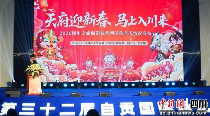 中新网四川新闻1月18日电 (刘刚 王磊)1月18日,“天府迎新春马上入川来”—第32届自贡国际恐龙灯会亮灯暨全省迎春文旅促消费活动启动发布会,在“中国灯城”自贡市举行。
