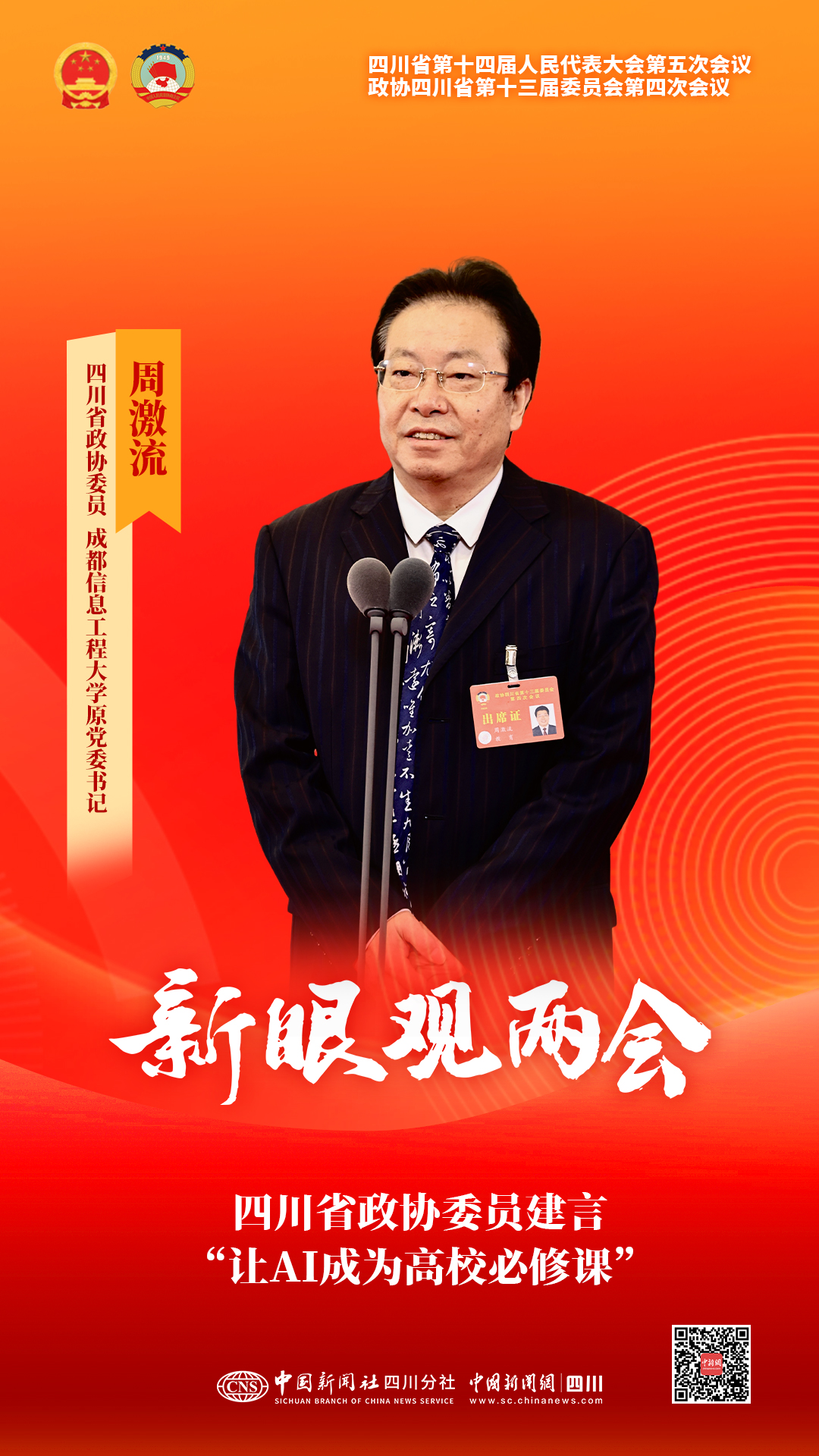 中新网成都2月6日电四川省政协十三届四次会议委员通道集体采访活动第三场6日在成都举行。在高校从事教学工作与人工智能研究近40年的四川省政协委员、成都信息工程大学原党委书记周激流,聚焦‘人工智能+教育’不断深化的背景下,高等教育如何兼顾技术应用与新产业赋能的核心议题,建言献策。