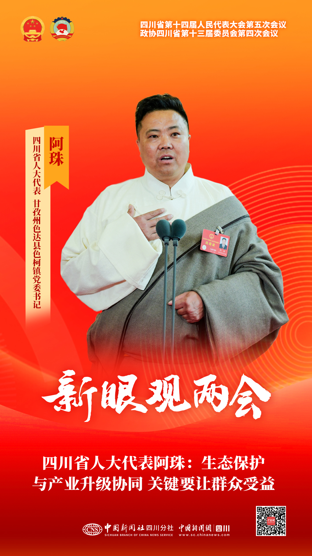 中新网成都2月3日电四川省十四届人大五次会议3日在成都开幕。在首场代表通道上,来自凉山的四川省人大代表、泸沽湖镇舍垮村党总支书记李比玛扎石讲述了带领村民守护泸沽湖生态、传承摩梭文化、发展乡村旅游,让乡亲们共享发展红利的履职故事。他说, 我将继续守好生态、传好文化、做好旅游,让乡亲们更好地享受发展红利。